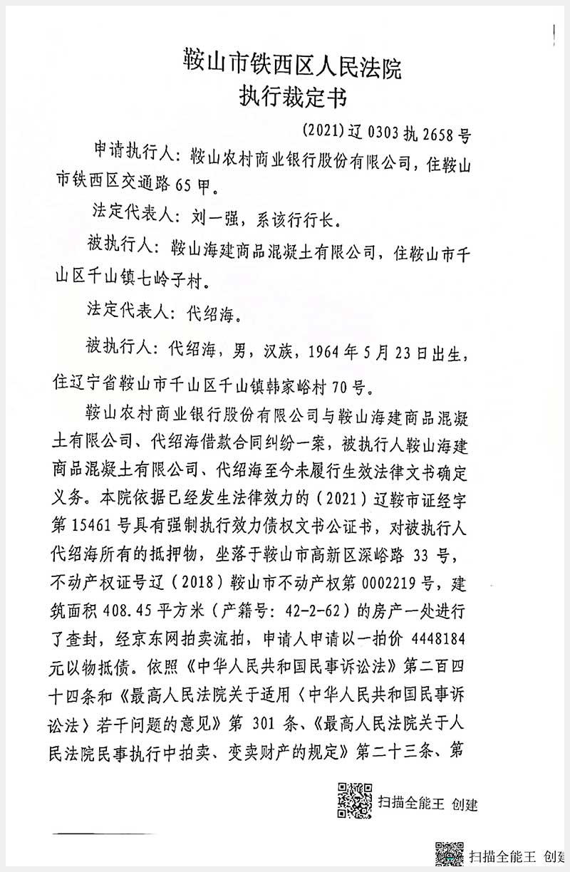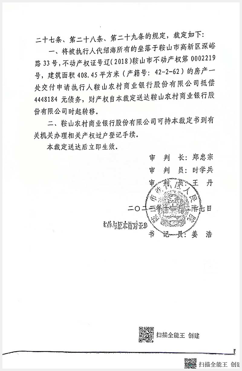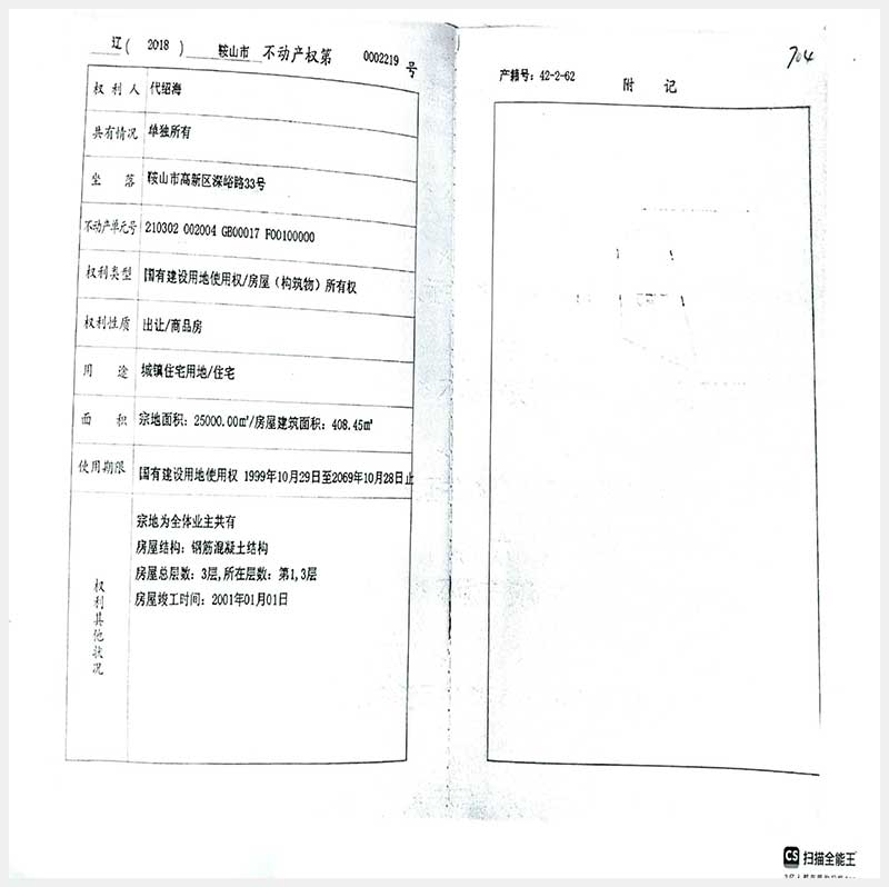 名稱:鞍山市高新區(qū)深峪路33號房產(chǎn) 面積:408.45㎡ 瀏覽次數(shù):212