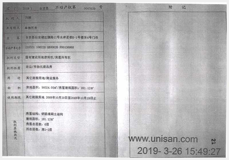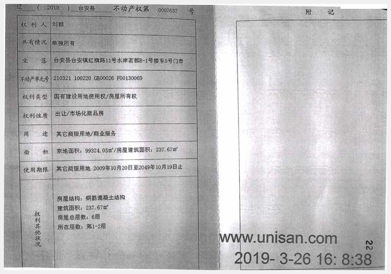 名稱:臺安縣臺安鎮(zhèn)紅旗路11號水岸茗都B-1號樓房產(chǎn) 面積:東4號:181.12㎡、東5號:237.67㎡ 瀏覽次數(shù):1028